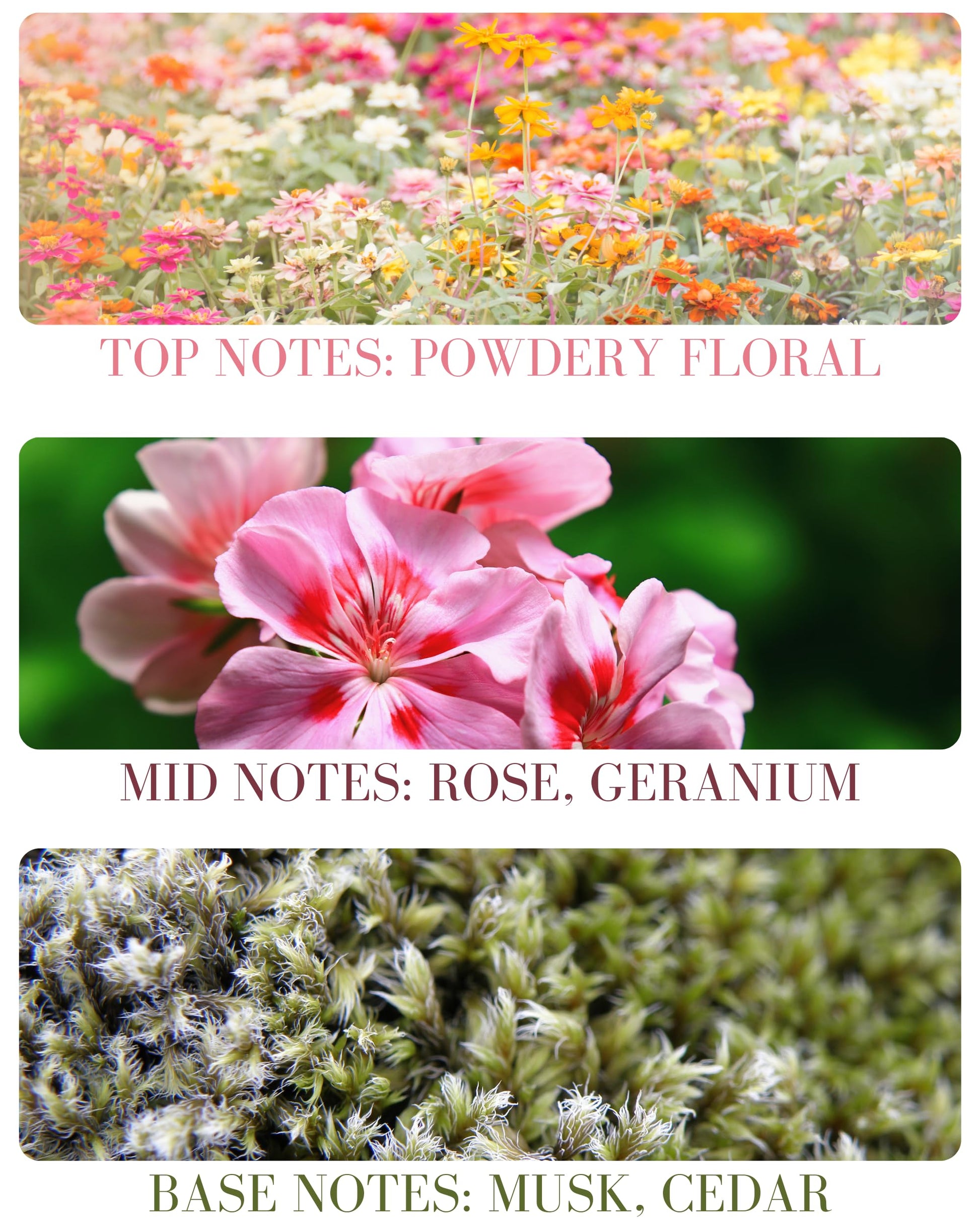 • SCENT PROFILE - Top: Powdery floral Mid: Rose, Geranium Base: Musk, Cedar. Not quite the scent of a newborn’s head, but maybe the next best thing. Powdery floral notes of rose, geranium, ylang ylang and patchouli with just a dust of cedarwood and musk.